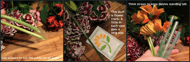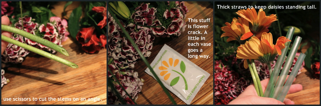 One of the many reasons Trader Joes is top on my list of grocery stores is the flowers.  My mom always has fresh flowers in the house and I try to do the same.  I buy a $10 bouquet and a $5 bouquet and design colorful and long lasting arrangements.