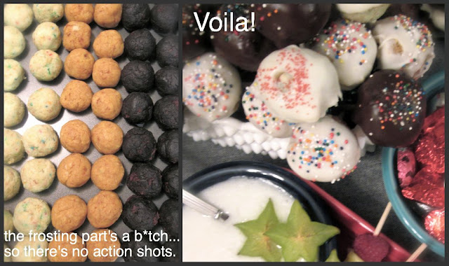 It all went pretty smooth until it came time to frost them. I wasn't able to get pictures of that process because my hands were too busy and covered in frosting, sprinkles, balls of cake and sucker sticks.